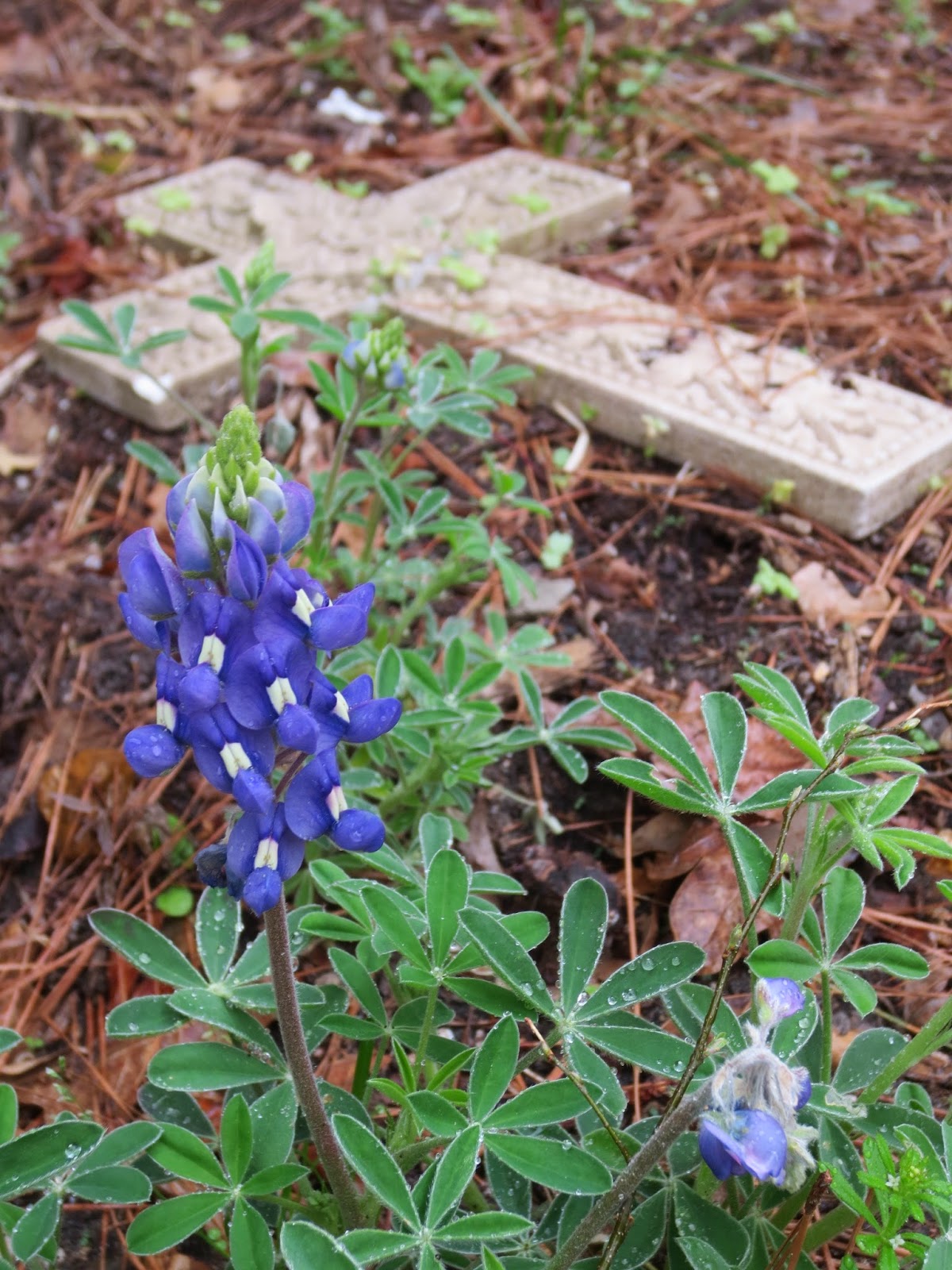 Meandering through my back yard after taking out the trash, I rested a bit with bluebonnets transplanted from my mother’s yard, and wood violets that pepper my yard with Lenten color, tucked into hidden and unexpected places, always a surprise that brings a smile.