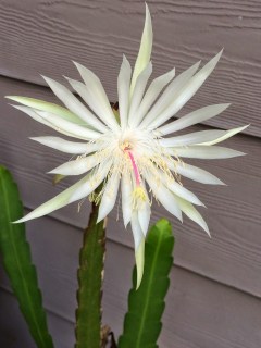 Yesterday as I was getting ready to leave for VBS, I peered out my window and noticed that my night-blooming cereus, which had struggled through our exceptionally cold winter, had put out it’s first bloom in at least a couple of years. If I’m not paying attention, I’ll miss this rare bloom; the flower opens up during the night, and is wilted soon after sunrise. It was a good reminder of how essential showing up silently and expectantly to God is. I may go a long, long time without “hearing” anything–but when I do, oh the wonder and beauty!