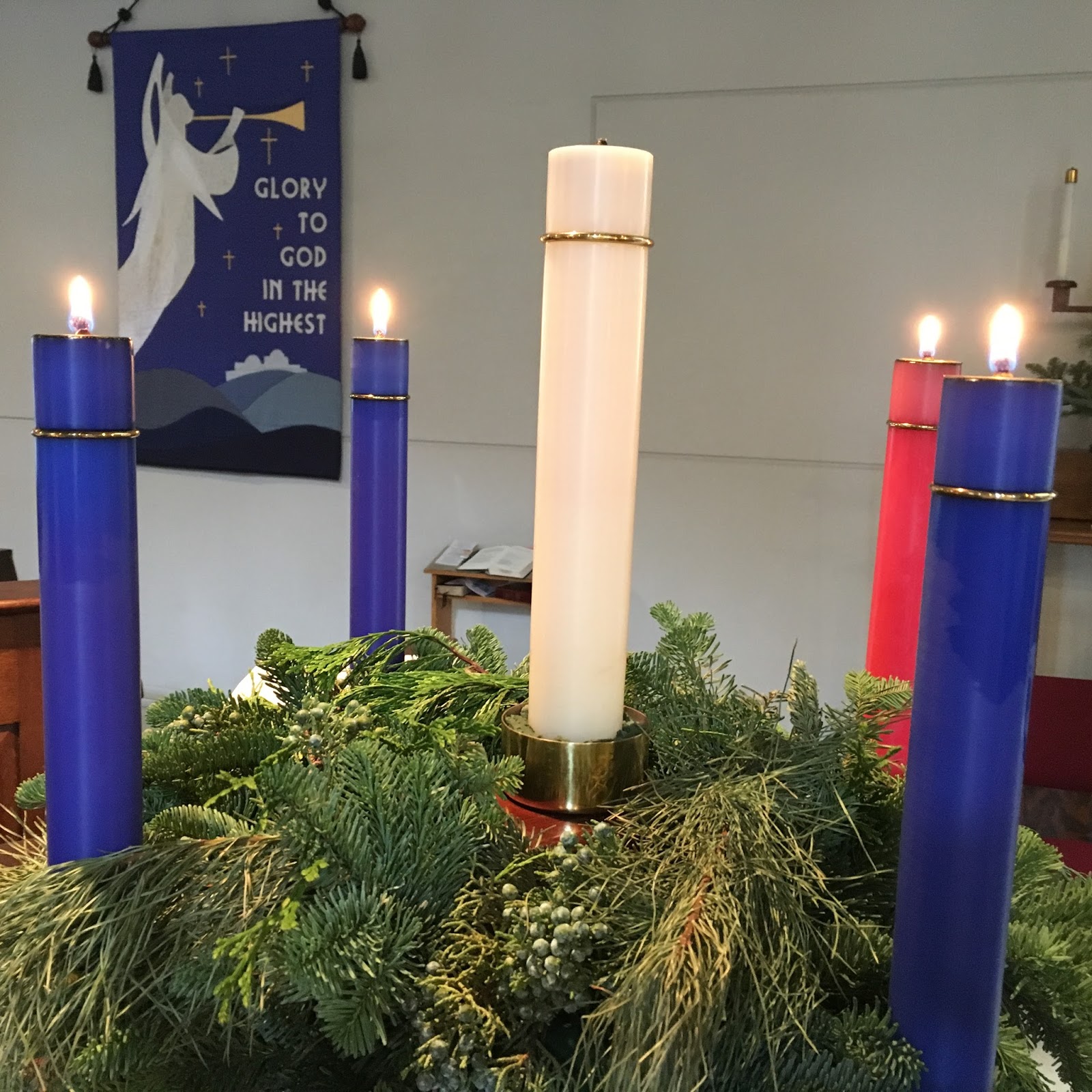 At St. Mary’s at nine o’clock this morning, three of us gathered to pray Morning Prayer. We lit three blue and one pink candle on the Advent wreath, and sat to listen and knelt to pray.