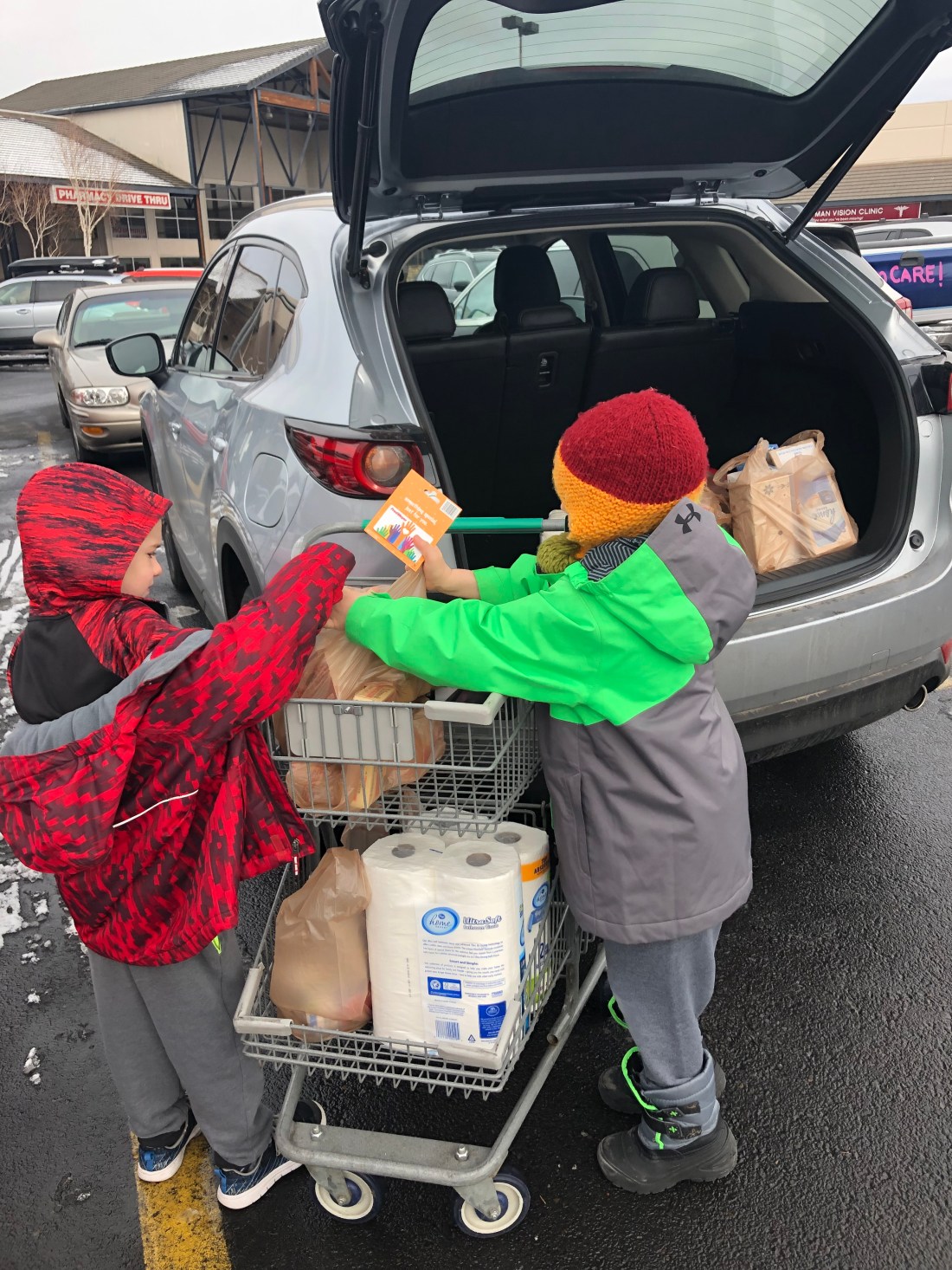 We shopped the local Fred Meyer, and the boys used their $100 to buy two $50 gift cards. I matched their gift by purchasing the items on the list. The boys chose which specific meat, cheese, butter, cereal, paper goods and other items we would buy (the ones they would want for themselves) for our friends at Bethlehem Inn.