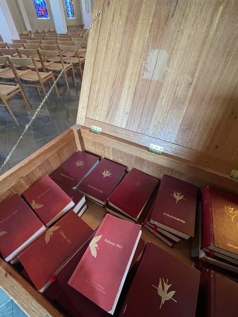 Thankfully, worship today was peaceful and beautiful. The building itself is a piece of art and the music (choir, organ, and piano) was the kind that invites prayer. Although I couldn’t mentally understand the words spoken (all in Icelandic, of course), the rhythm of the Eucharist and the sound of hymns (some with familiar tunes) along with exquisite places to rest my eyes within a community of praying people made for rich, rich worship.