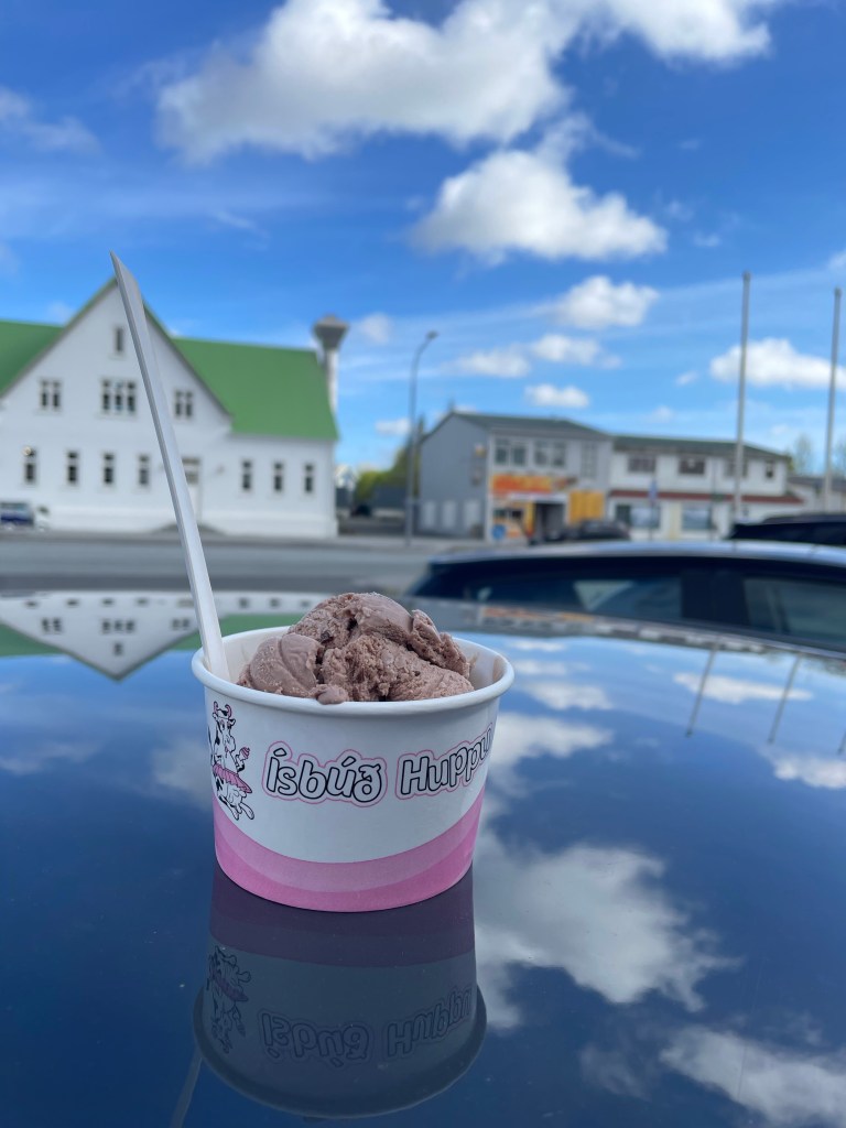 After a stop at a once again unlocked church for prayers, we made one pause for local ice cream. It was a bit tricky to make a selection since every option was in Icelandic, but somehow I could decipher enough for delicious choices.