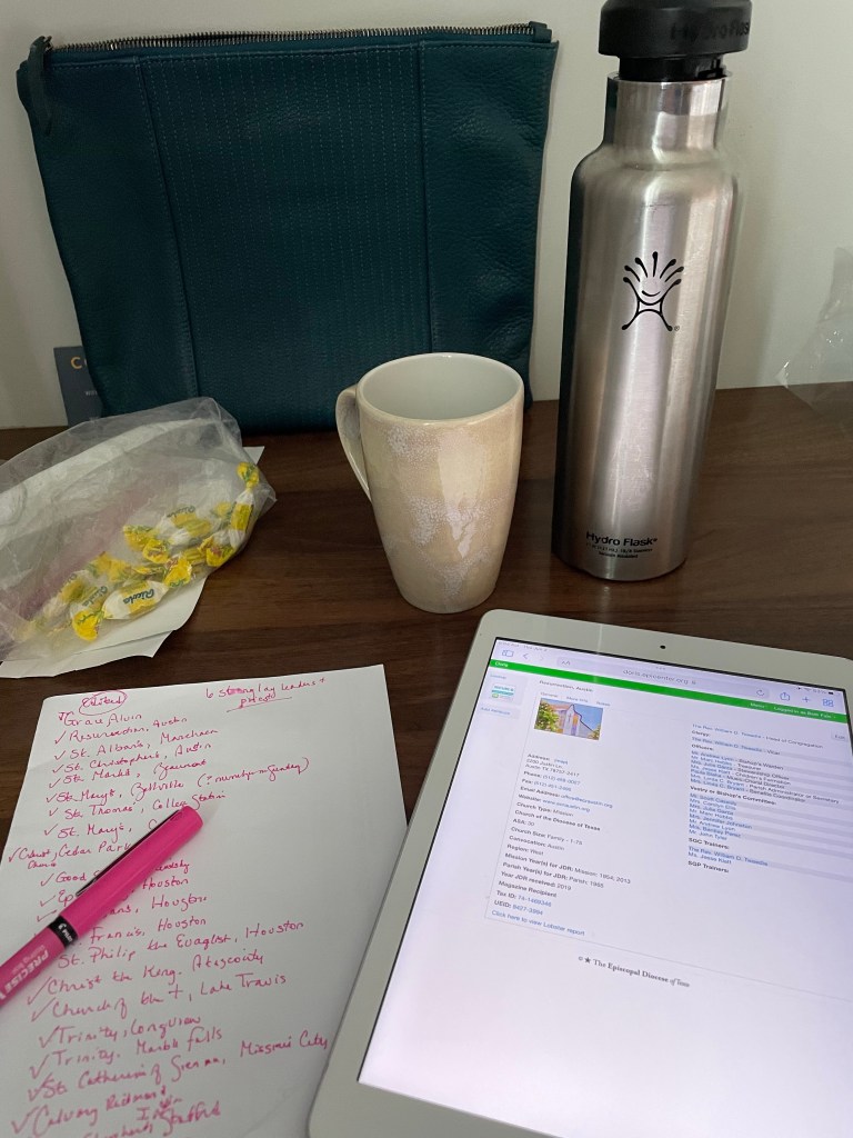 I’ve been able to set up a little office in my hotel room, and between naps, working via zoom using my iPhone and iPad. My internet connection is excellent, and I have easy charging stations next to my desk. I’m a bit slower than usual, and I’m finding extra time to pray for congregations and people I serve as I move through my work tasks.