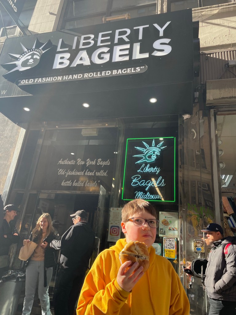 Another bus and train ride back to hotel, we decided to call it an early night, with a Liberty Bagel feast, and a streaming of the original Spider-Man, which somehow, Austin had never seen—chosen by him because it is set in NYC.