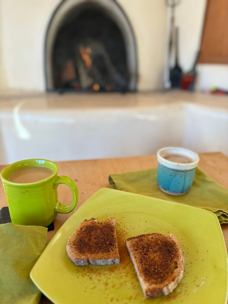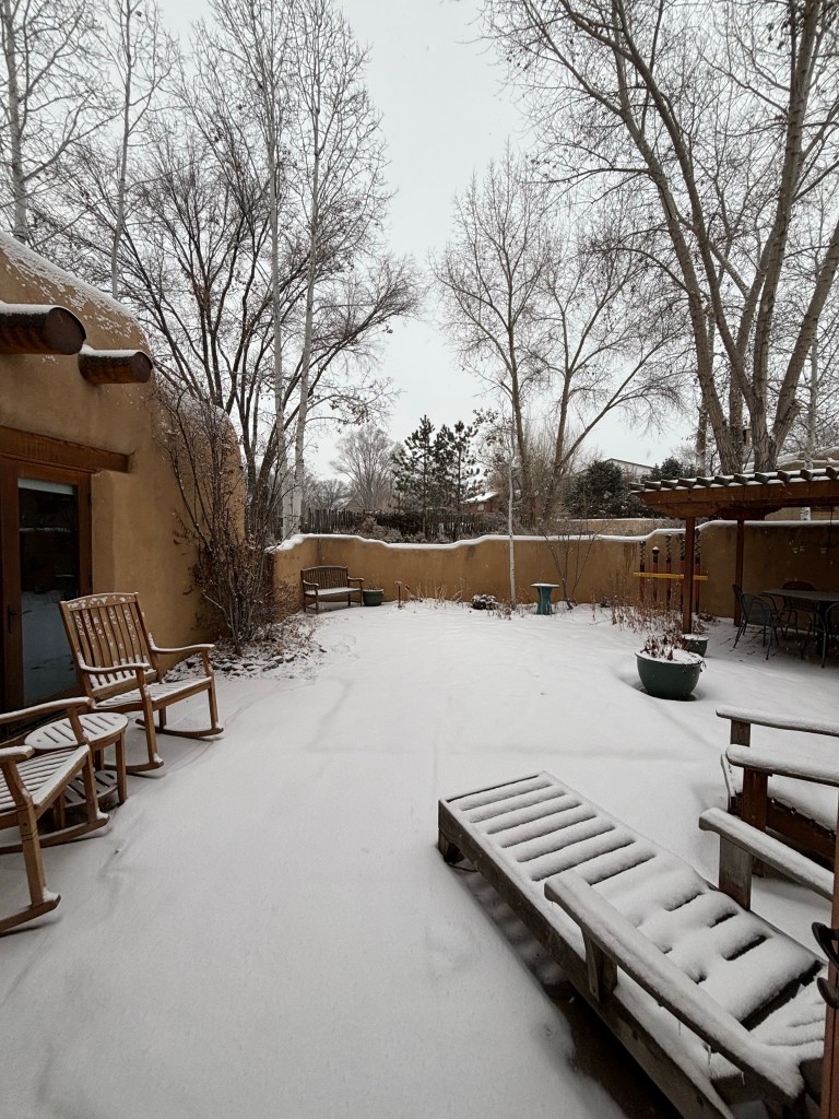 Yesterday we awoke to a winter wonderland—such a wonderland that even the schools in Taos closed. Thinking that it would be impossible to leave, we took stock of our provisions. Raisins. Cheese. Bread. Milk. Coffee. Nuts. And then we remembered three Kind bars, and then I opened a door to the Casa’s tiny pantry, and there was oatmeal and pasta and chicken broth and mac and cheese. We had electricity and water, and we were set with more than enough.