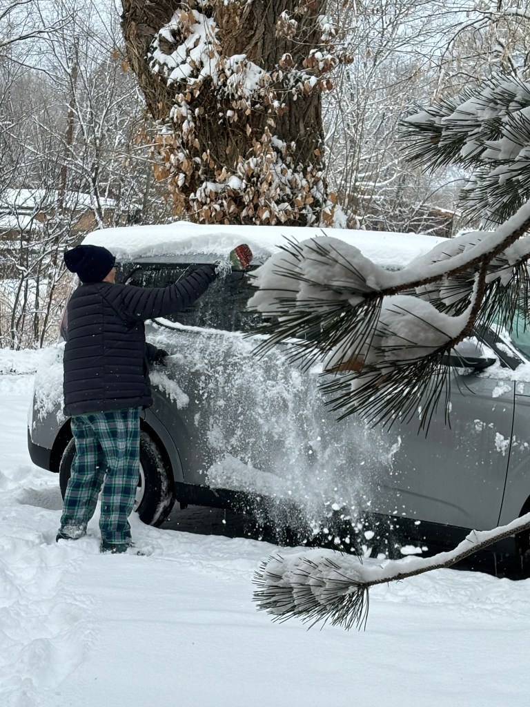 Later the streets began to be plowed and sanded, and so we were able to get out. Of course, my best friend did have to use the supplies we had available—a fireplace brush and dish towels—to help back out the car.